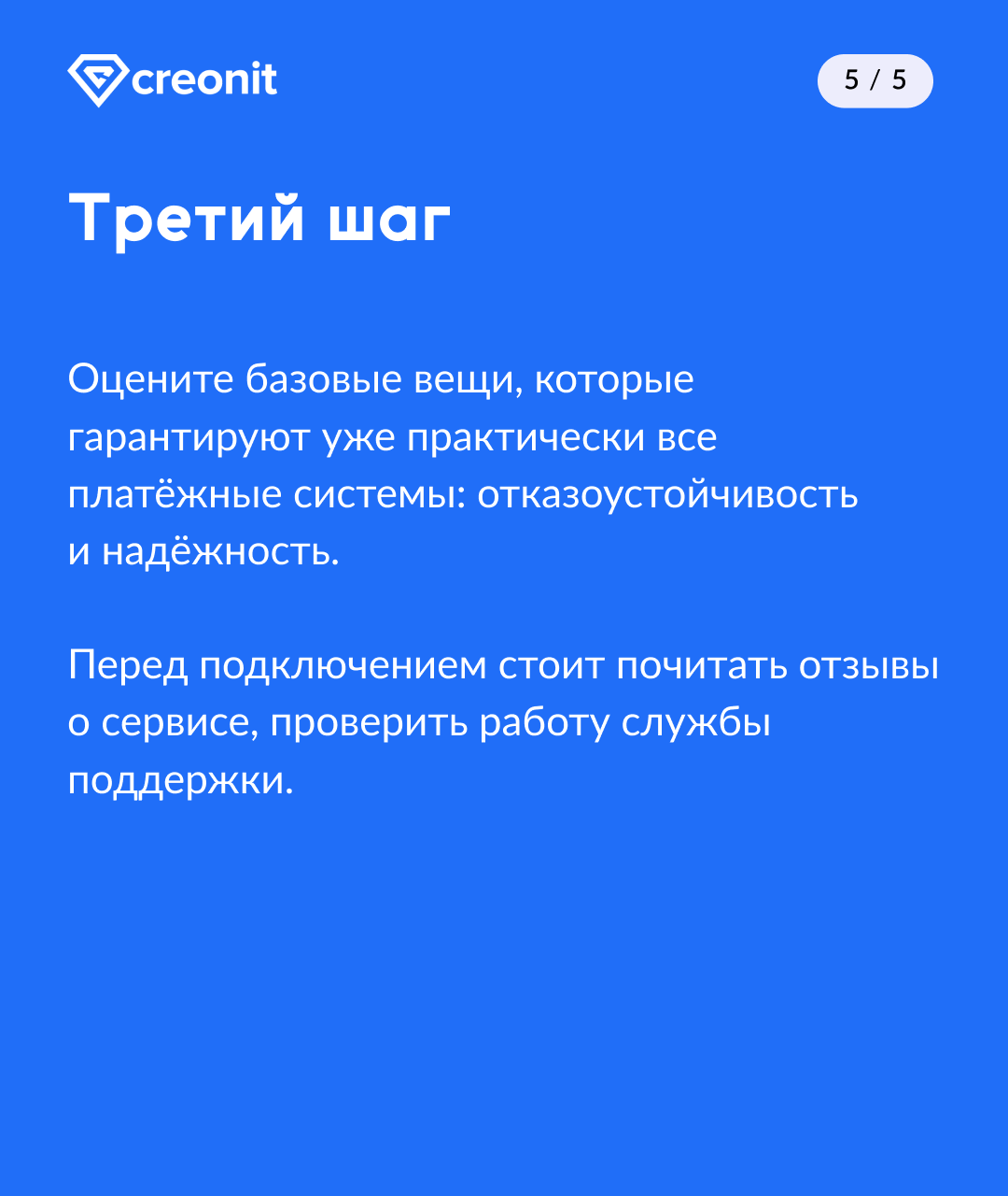 Оцените базовые вещи, которые гарантируют уже практически все платёжные системы: отказоустойчивость и надёжность. Перед подключением стоит почитать отзывы о сервисе, проверить работу службы поддержки.