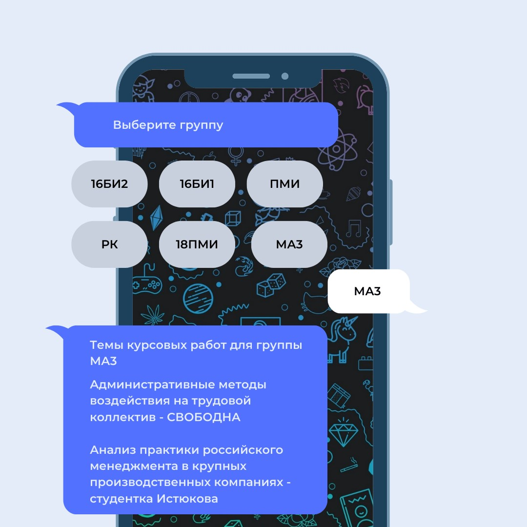 Пример, если в запросе пользователя есть слово «Поступление», бот будет присылать ему правила приёма в вуз или ссылку на сайт для абитуриентов.
