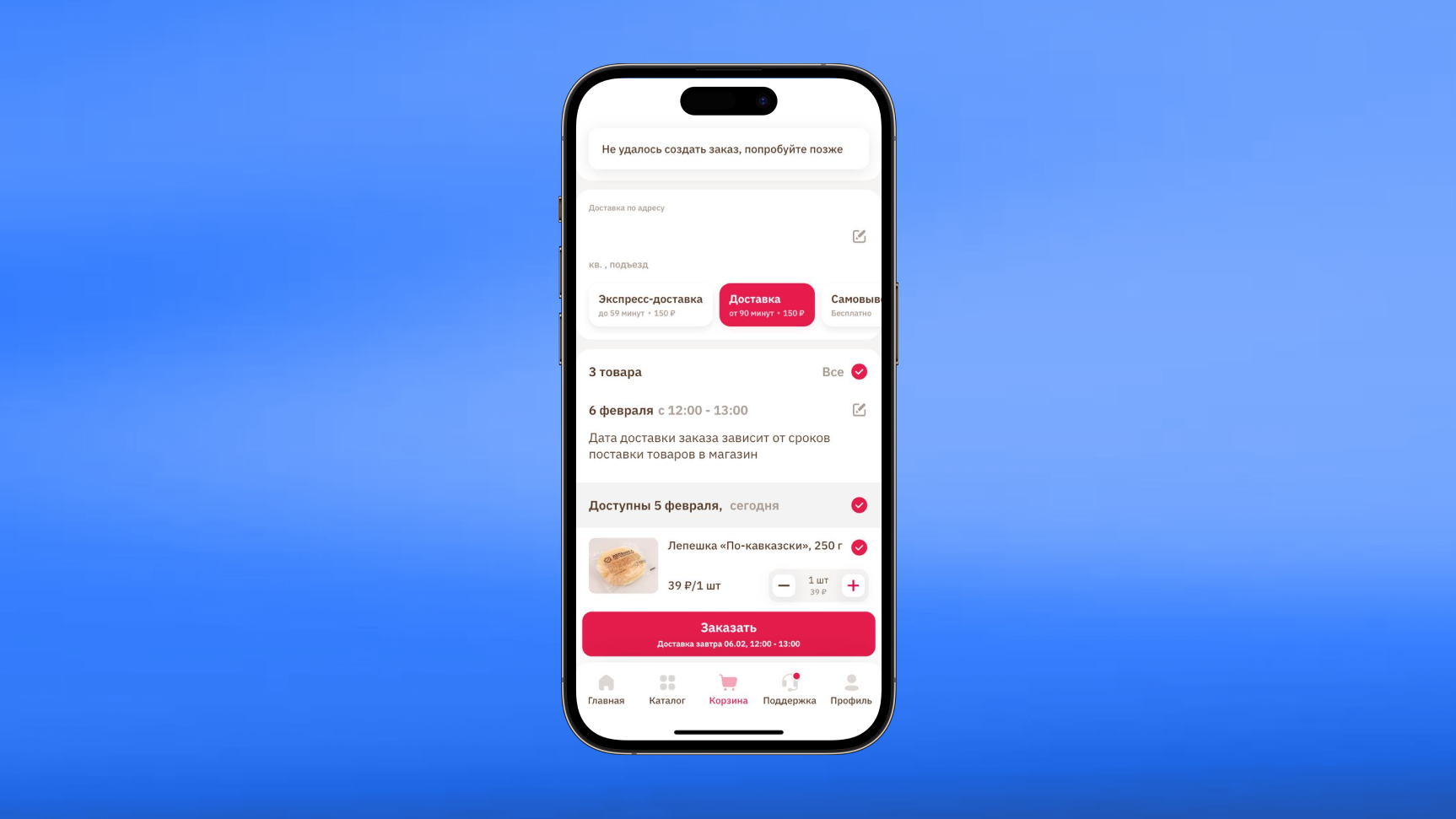 Хуже отсутствующей корзины в приложении — только её неработающая версия. Например, в приложении «Калина-Малина» пользователь может столкнуться с ситуацией, когда он выбрал товары, указал время доставки, вбил адрес и уже оформляет покупку. В это время ему приходит уведомление: «Не удалось создать заказ». Почему так и что делать — не сообщают.