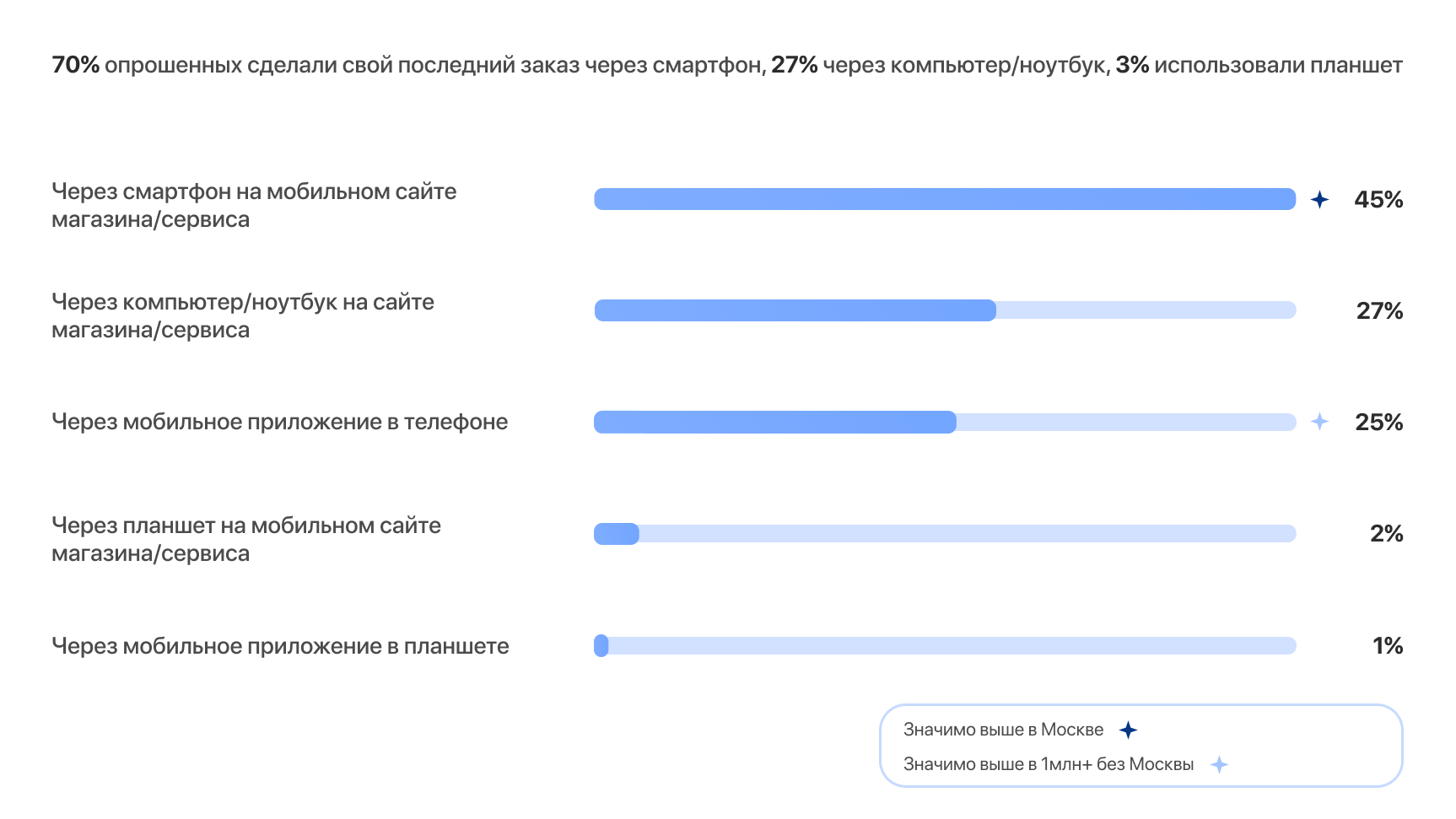 Доля мобильных покупок на рынке eGrocery высокая. В опросе Data Insight 40% опрошенных заявили, что делают заказы продуктов через интернет регулярно, несколько раз в месяц. При этом 70% респондентов ответили, что сделали свой последний заказ через смартфон.