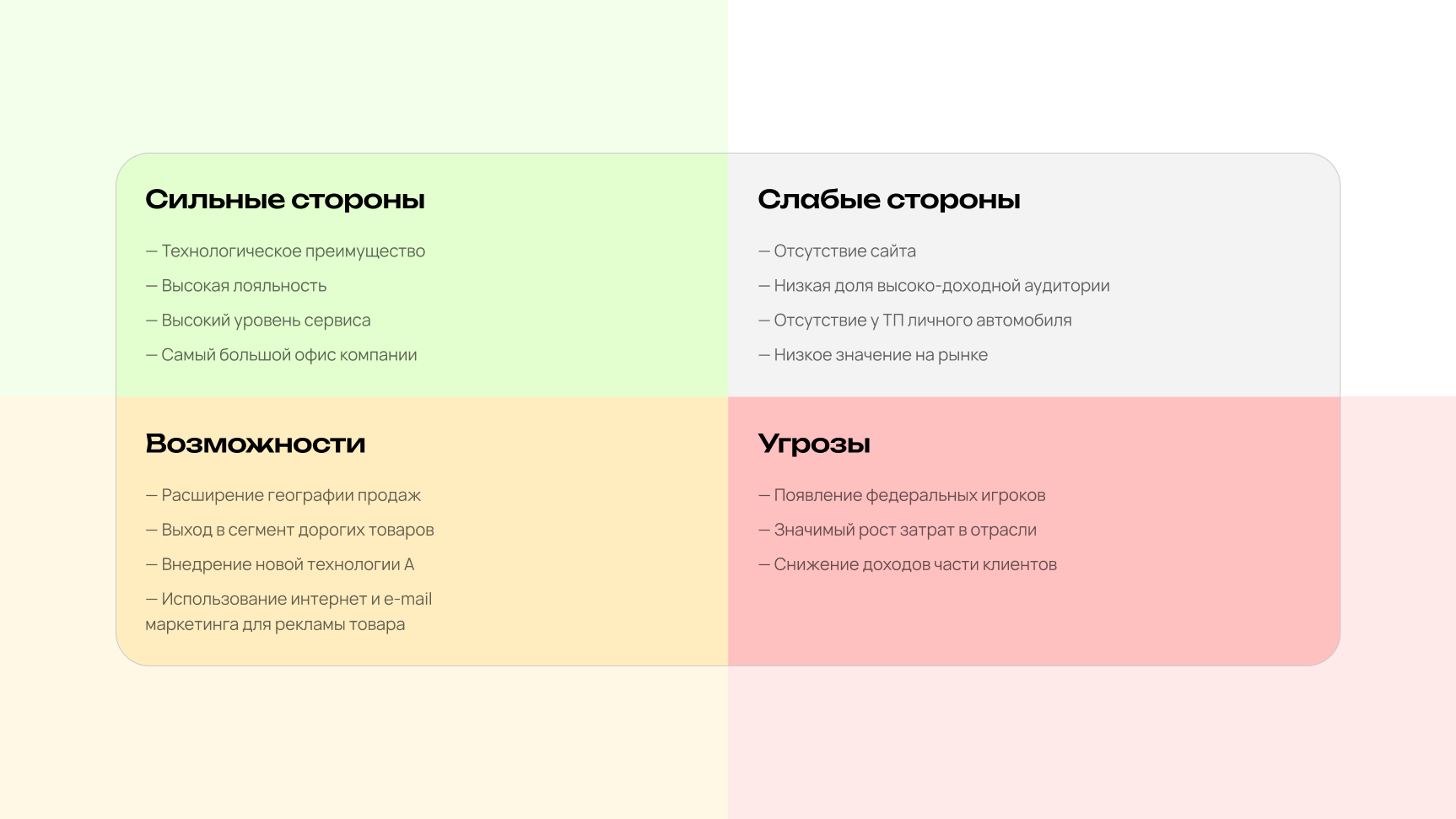 1. SWOT-анализ. Этот фреймворк помогает подчеркнуть сильные и слабые стороны компании или продукта, а также выделить внешние возможности и угрозы, связанные с конкурентами.