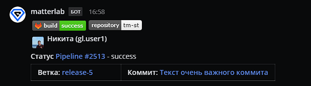 Теперь каждый раз, когда срабатывает CI/CD (сборка проекта на сервере), в канал Mattermost, откуда вызвали приложение, приходят уведомления о статусе завершения сборки.