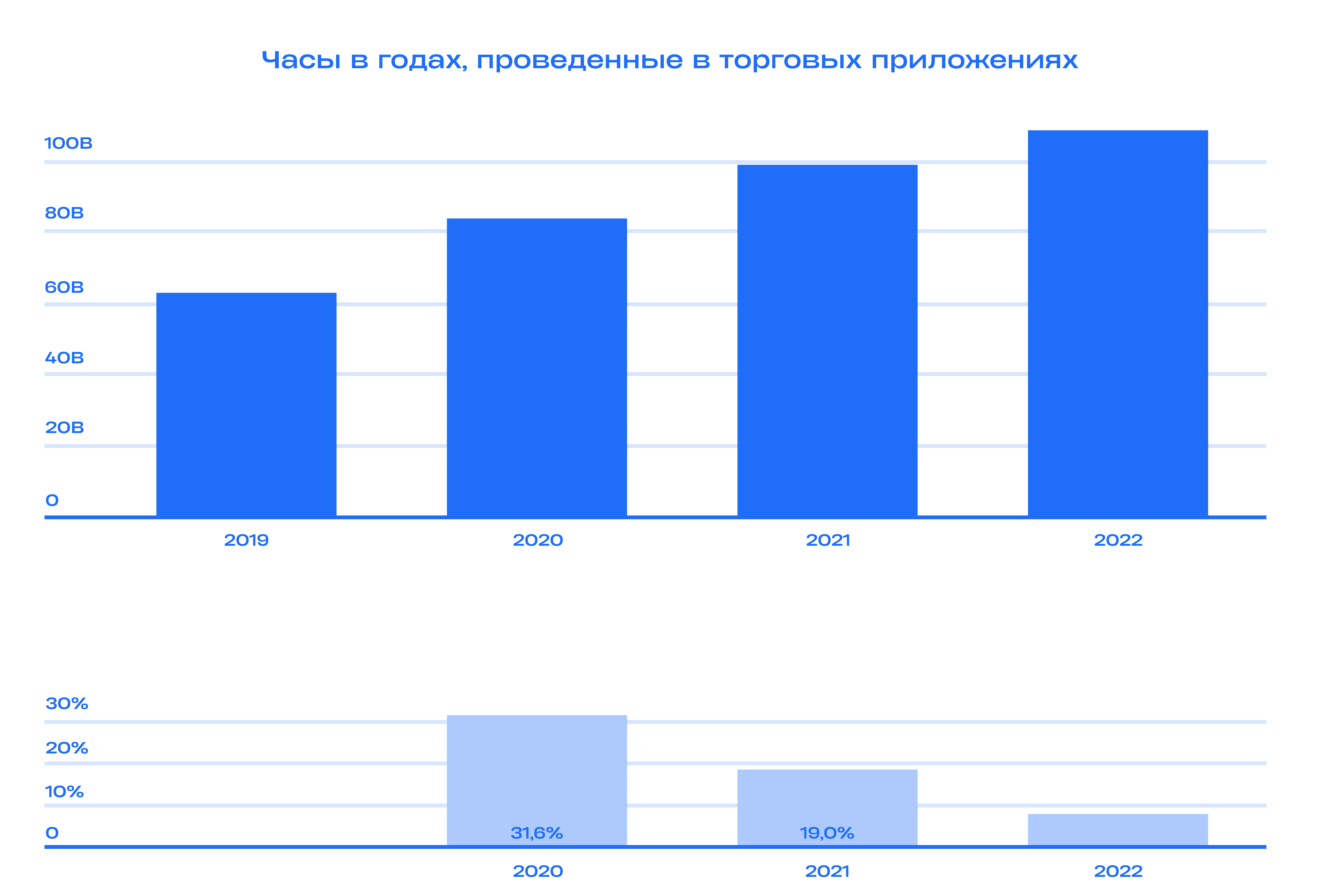 Число мобильных покупок, количество установок приложений и длительность сессий в них также продолжают расти.