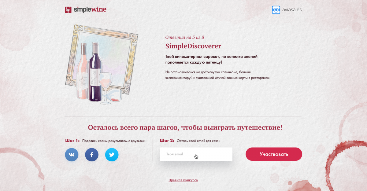 Пользователю предлагают поделиться акцией в соцсетях и указать контактный email для участия в розыгрыше.