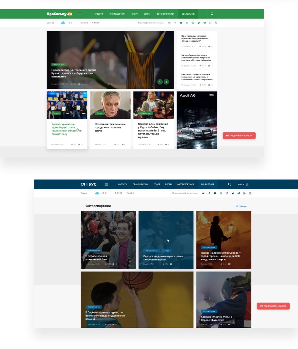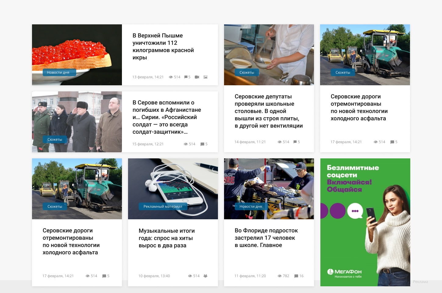 Выбрали блочную систему, чтобы можно было расставить приоритеты на десктопе: большая часть посетителей заходила с ПК. Использовали сетку и разные карточки — они могут быть рекламными баннерами, публикациями или объявлениями. Это удобно для пользователей и дает вилку по цене для рекламодателей: блоки можно продавать как в газете — от небольших объявлений до разворотов.