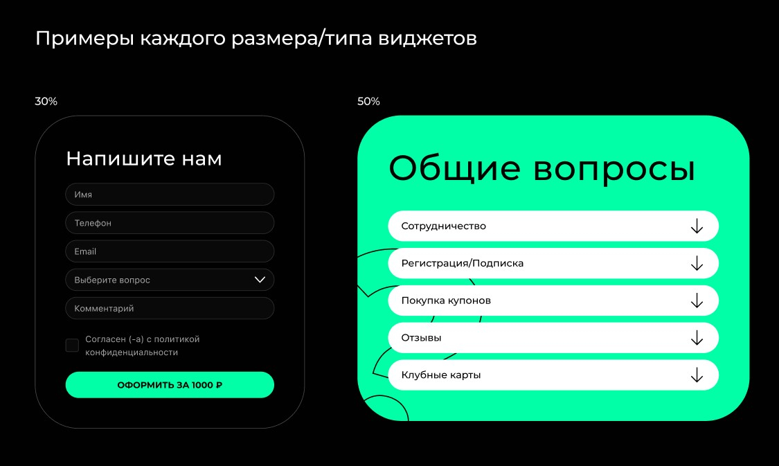 Мы проработали UI-kit и рекомендации по процессу создания виджетов: показали сетку, указали нужные размеры виджета. Благодаря этому клиенту не нужно думать, как и что ровно встанет в нужную страницу – мы за него уже все придумали.