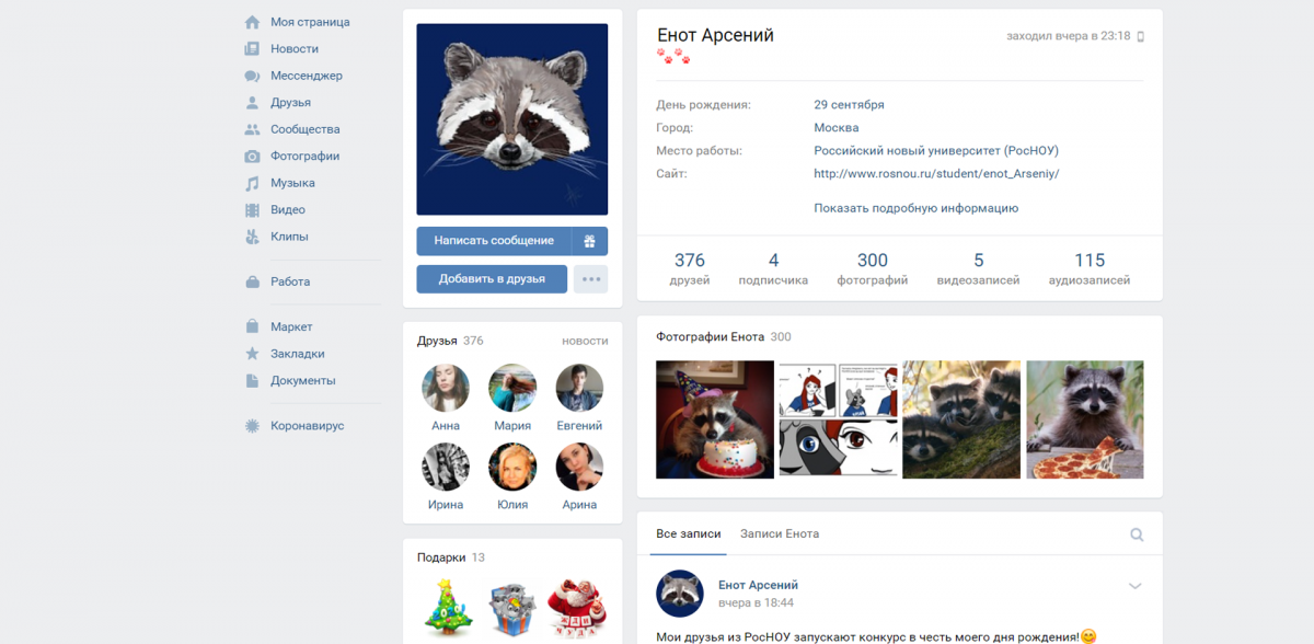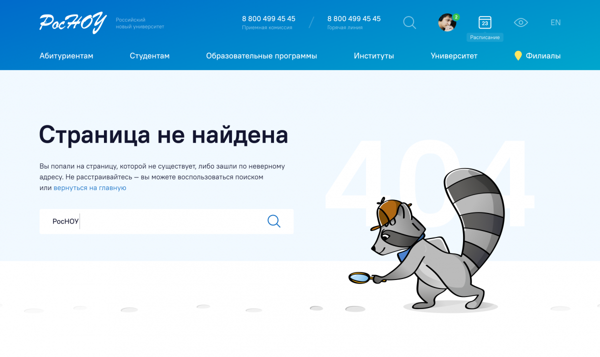 Если вы попадёте на страницу 404, то увидите маскота РосНОУ — енотика, у которого даже есть своя страничка в VK.