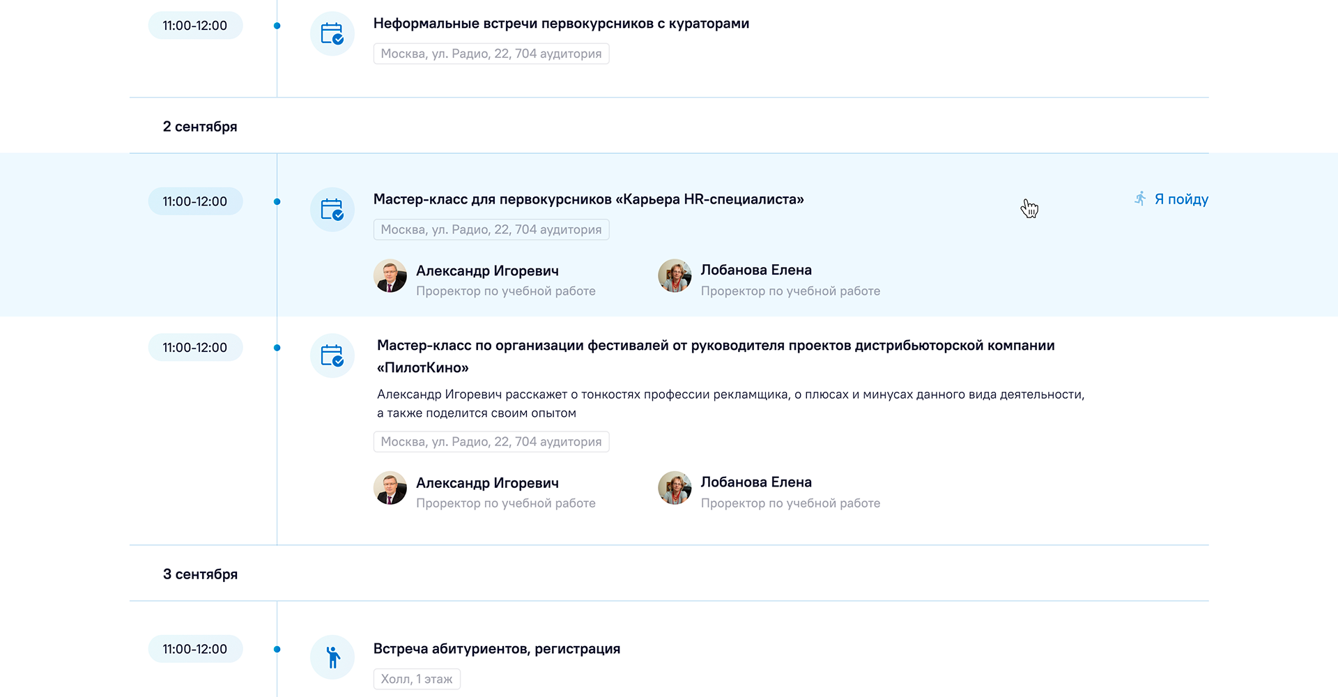 Для страницы мероприятия предусмотрен специальный вспомогательный виджет — расписание. Мы учли в нём разные вариации, например, параллельные потоки в одном мероприятии.