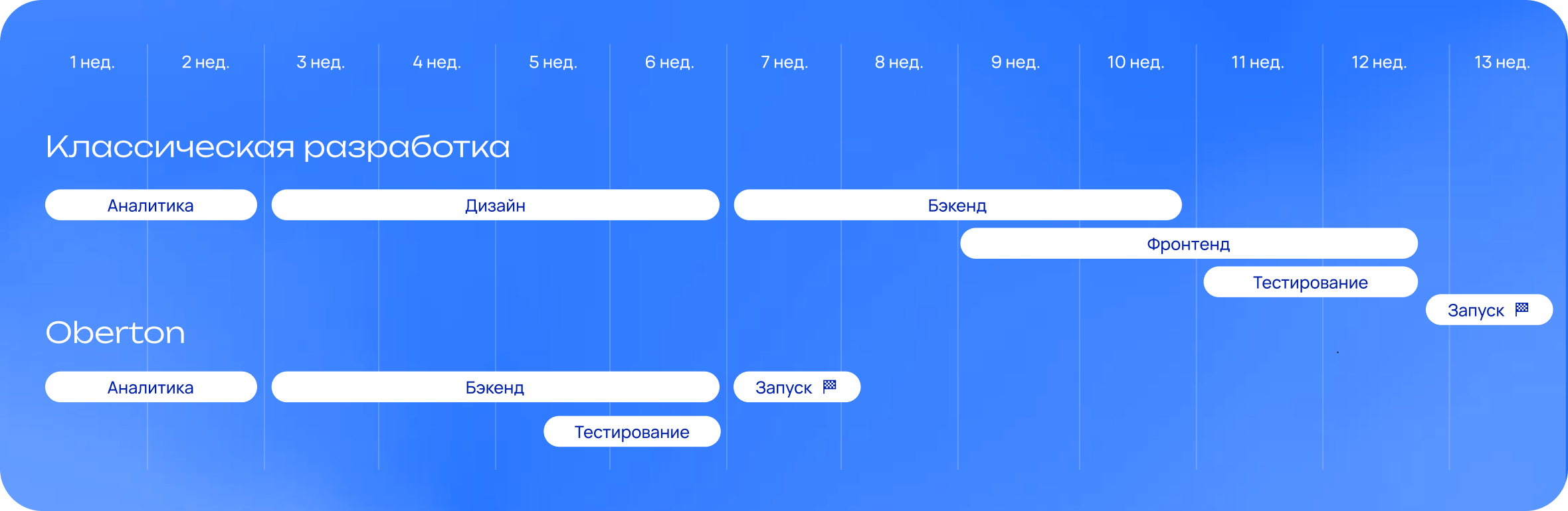 Oberton — наша собственная платформа для low-code разработки, которая позволяет экономить десятки миллионов рублей на создании продукта. На её базе можно разработать любой веб-сервис. Стоимость проекта от 0.6 млн.