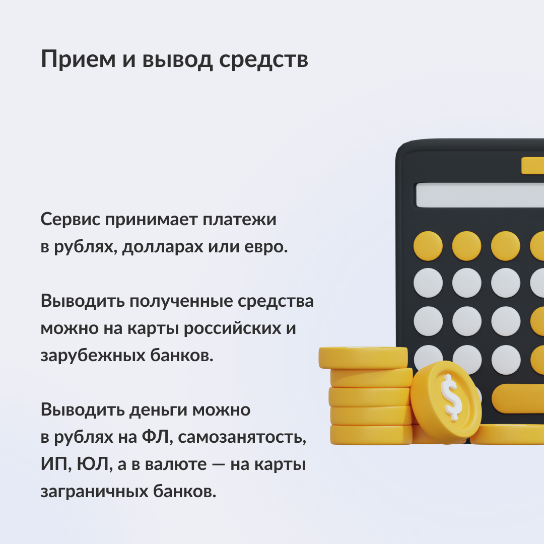 Сервис принимает платежи в рублях, долларах или евро. Выводить полученные средства можно на карты российских и зарубежных банков.